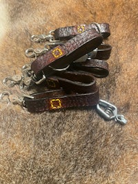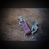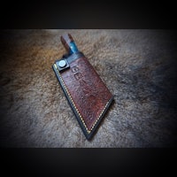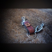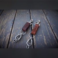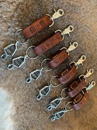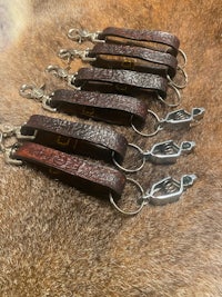 These are made from 7-8 Oz leather and hand cut, dyed, and stamped. Perfect for your keys or for your work gloves