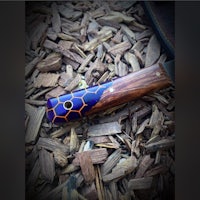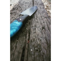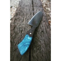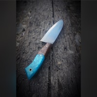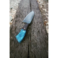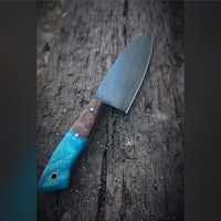 Here is my western Santoku wearing blue resin with Wenge and Paduak. It is 3/32” 1095 high carbon steel.
