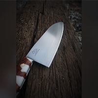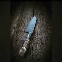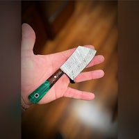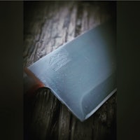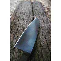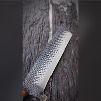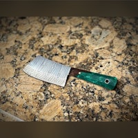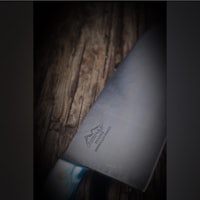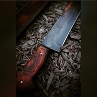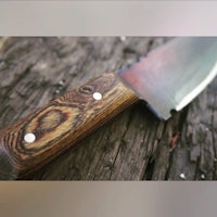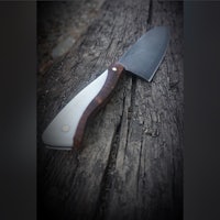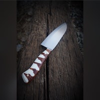 This Santoku was made with 1080 3/32” high carbon steel that was heat treated and tempered. It is wearing maple and white resin handles. “Made to order, build to last”