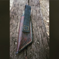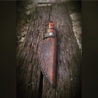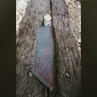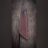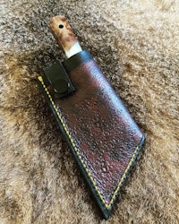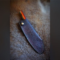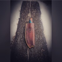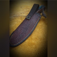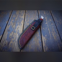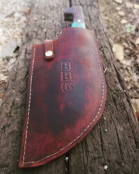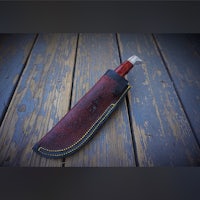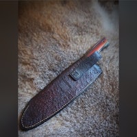 This work knife is 3/32” 1095 High Carbon Steel and is wearing maple and ruby resin scales. The custom sheath is made of 8oz leather and was made by me in the USA