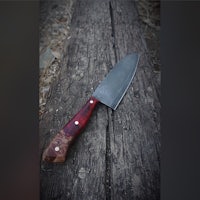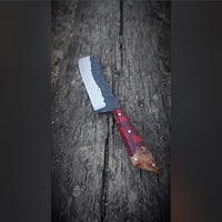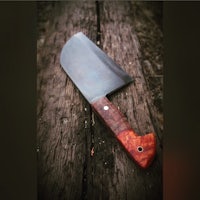 This Santoku was made from 1/8” 1095 high carbon steel that had heat treated and tempered. It is wearing red resin and maple handles. She is sharp and durable. “Made to order, build to last”