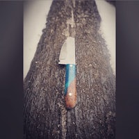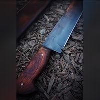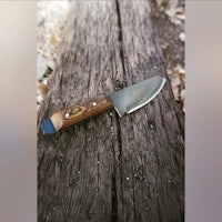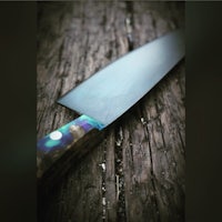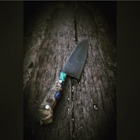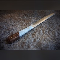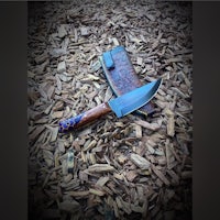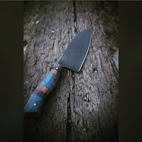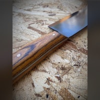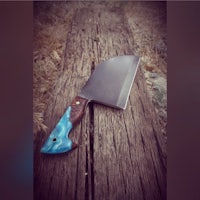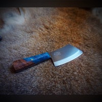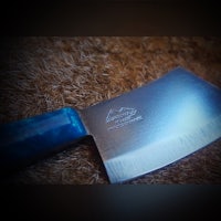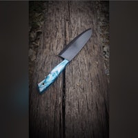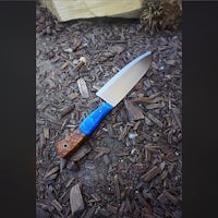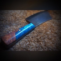 This knife was made for a chef who wanted something lightweight and custom looking. This is 15n20 high carbon steel and its wearing maple and blue resin handles