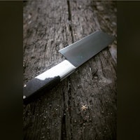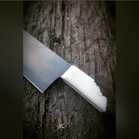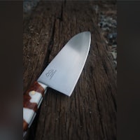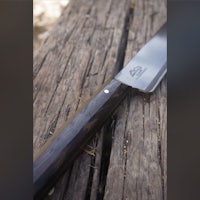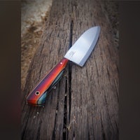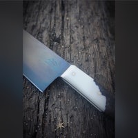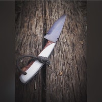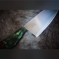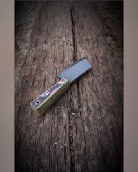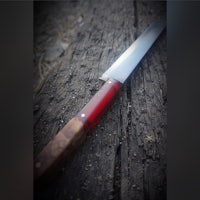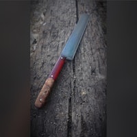 This western Usuba is 3/32” 1095 high carbon steel and its wearing white resin with dyed maple handles. “Made to order, build to last”