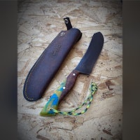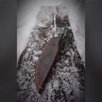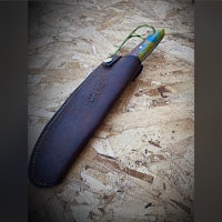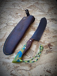 This work knife is 3/32” 1084 High Carbon Steel and is wearing maple and emerald resin scales. The custom sheath is made of 8oz leather and was made by me in the USA