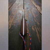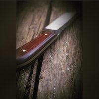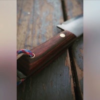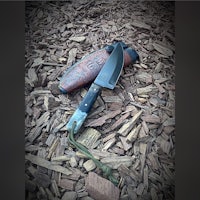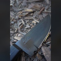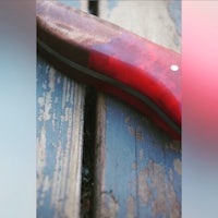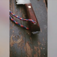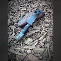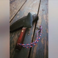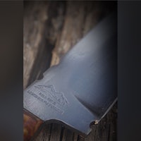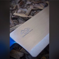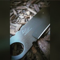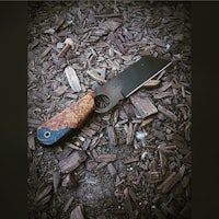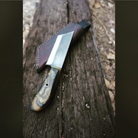 My friend B wanted something to take camping that would be able to process campfire dinners but also be used to baton wood as well as make feather sticks. It’s 1084 high carbon steel and is wearing red resin with maple handles
