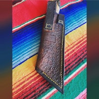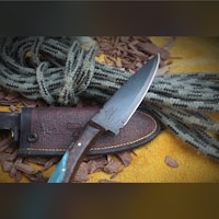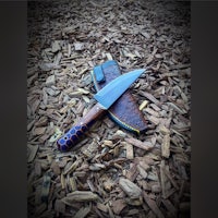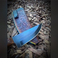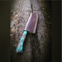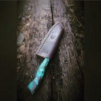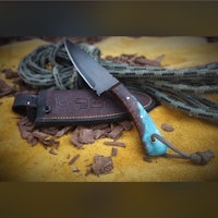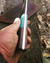 This is another American Santoku I did for a customer to give as a Christmas gift. It is 3/32” 1084 high carbon steel and it is wearing turquoise resin scales and a custom sheath. Everything is made by me in the USA