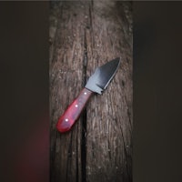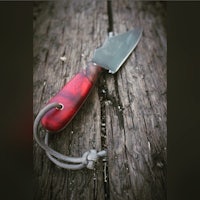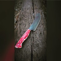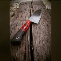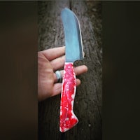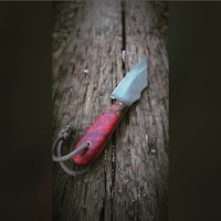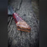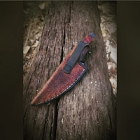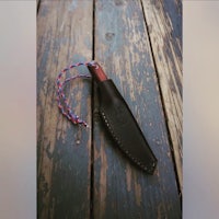 This bushcraft style knife is made from 1/8” 1095 high carbon and wearing red resin and maple handles