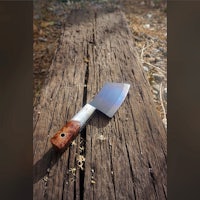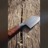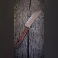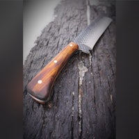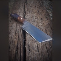 This large competition chopper was made from an old farriers rasp/file and is wearing cocobolo handles. It is tailor made for processing firewood and opening cans and whatever else is thrown at it