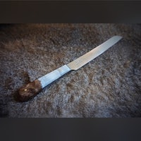 This was a fun build. This brisket knife has a 13” blade as is wearing red resin and maple handles. The knife is 1095 high carbon steel that has been heat treated and tempered. “Made to order, build to last”