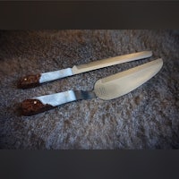 I made these for a friends wedding. They’re 1095 high carbon steel and they’re wearing pearl resin with maple handles