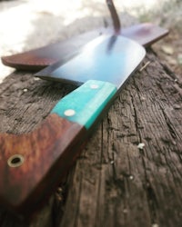 Here is another Santoku I did for a customer. As usual, it’s 3/32” 1095 high carbon steel - heat treated and tempered. She’s wearing turquoise resin and maple handles. “Made to order, build to last”