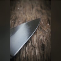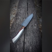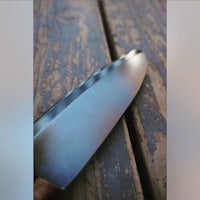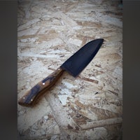 This Santoku is 3/32” 1084 high carbon steel. It has been heat treated and tempered. Shes wearing maple and white resin scales. “Made to Order - Built to Last”