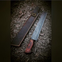 This massive 1/8” Japanese nata is wearing cocobolo handles and has a custom sheath. It is roughly 36” in length