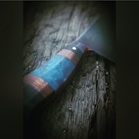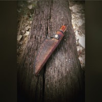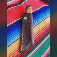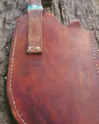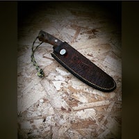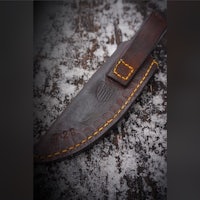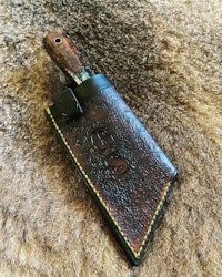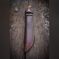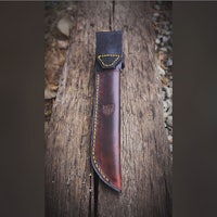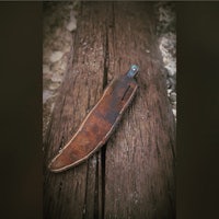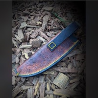This bad boy is 3/16” thick and wearing copper resin and maple handles. The knife has polished brass 1/4” pin as well as a 1/4” brass lanyard tube. The sheath is handmade and includes an initial and USA stamp.