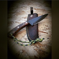 This knife was made for a friend in the military who wanted something to carry on his days off for protection. It is 1084 high carbon steel and is wearing Mexican bocote handles. It has a pry bar and custom sheath.